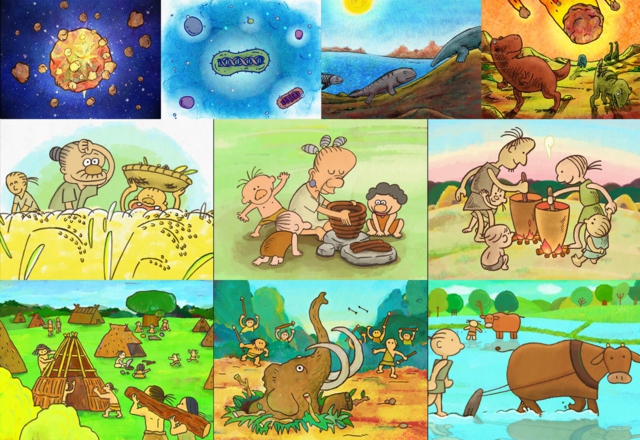 - その中の素材として地球誕生から生物の進化、人類の生活など、