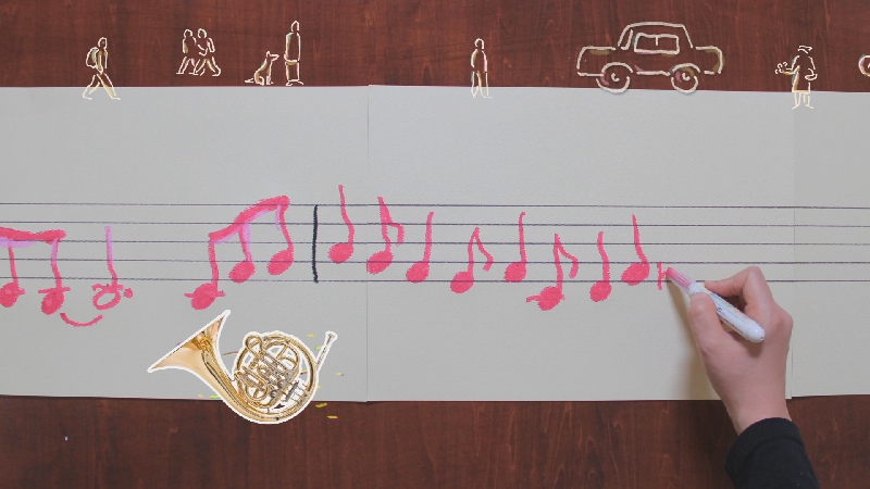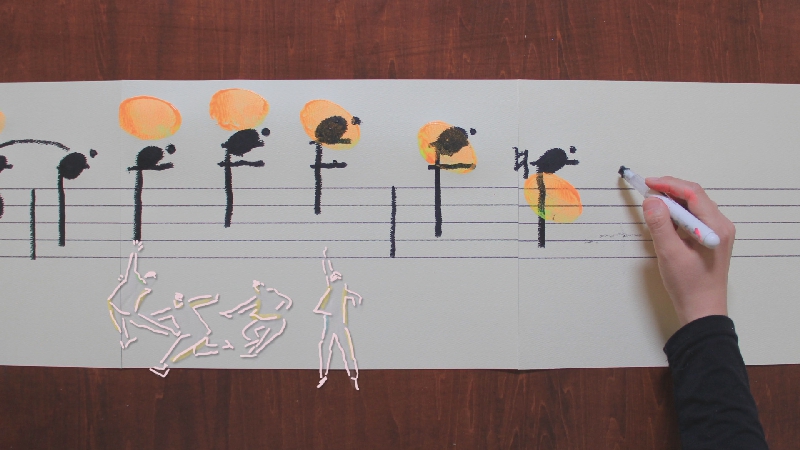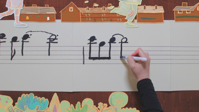 - 撮影方法は一瀬が描く音譜を上甲が手動でタイムラプス風にコマ撮りし、一部をピクシレーションしています。