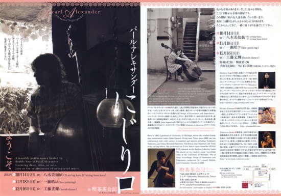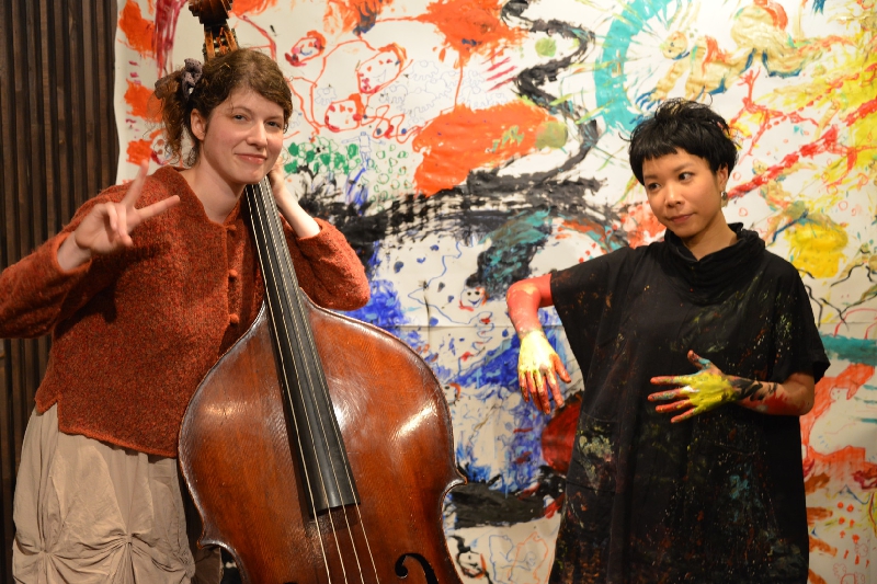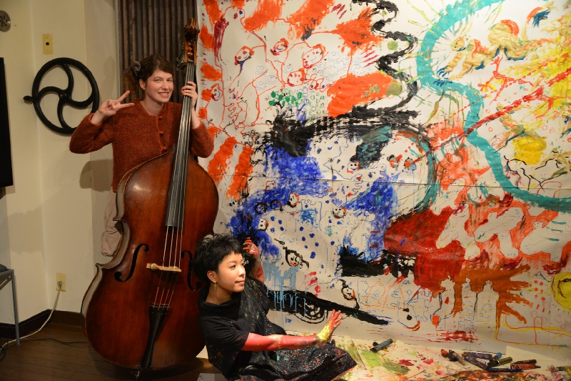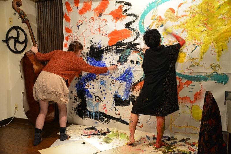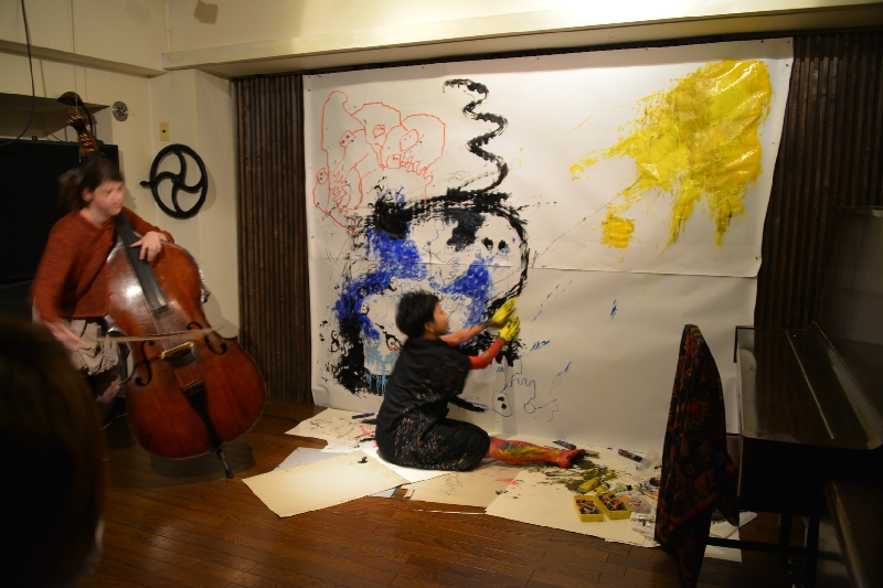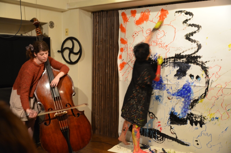 2012.11.18 sun『にじり口』コントラバス演奏者パール・アレキサンダー氏と一瀬皓コのライブペインティングによる共演が行われました。会期:2012年11月18日(日)時間:14:30 開場 / 15:00 開演場所:四谷三丁目駅より徒歩3分「喫茶茶会記」料金:事前予約 \2300 / 当日 \2500 (ドリンク付き)
