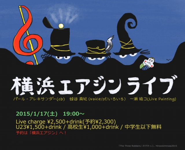 『横浜エアジンLIVE TRIO2!』蜂谷真紀 (vocal) 一瀬皓コ (live painting)Pearl Alexander (bass)会期:2015年1月17日(土曜)時間:19:00~Live charge:2,500+drink(予約\2,300)U23\1,500+drink / 高校生\1,000+drink / 中学生以下無料横浜エアジン