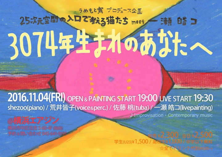 - 出演:一瀬 皓コ(livepainting) / shezoo(piano) / 荒井皆子(voice&perc.) / 佐藤 桃(tuba)